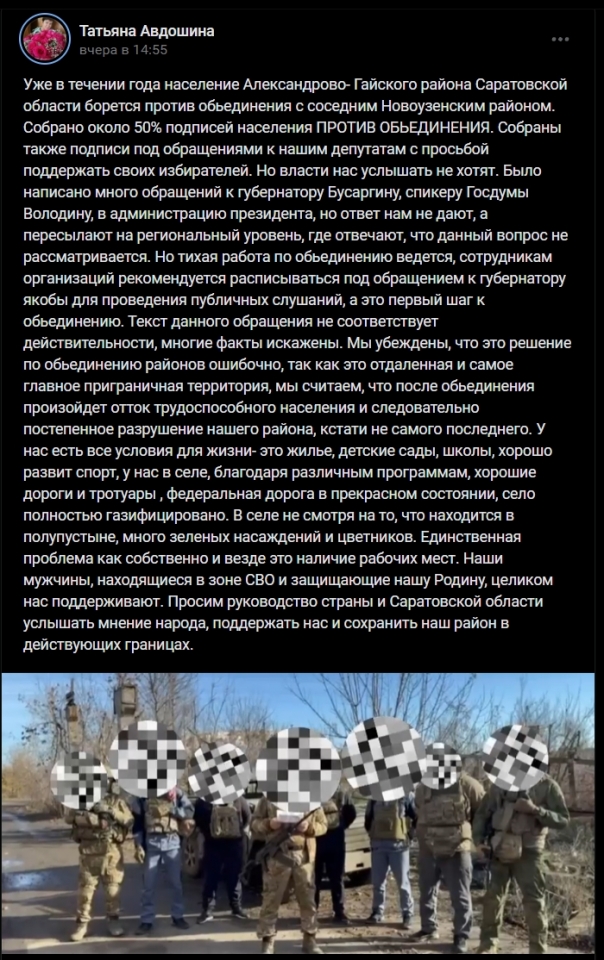 Просим обратить внимание на нашу ситуацию и принять меры для сохранения целостности Александрово-Гайского района.