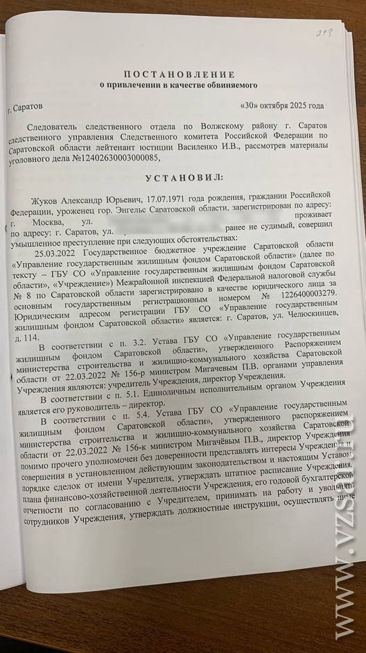 Региональное СУ СКР предъявило обвинения директору ГБУ СО "Управление государственным жилым фондом Саратовской области" Александру Жукову.