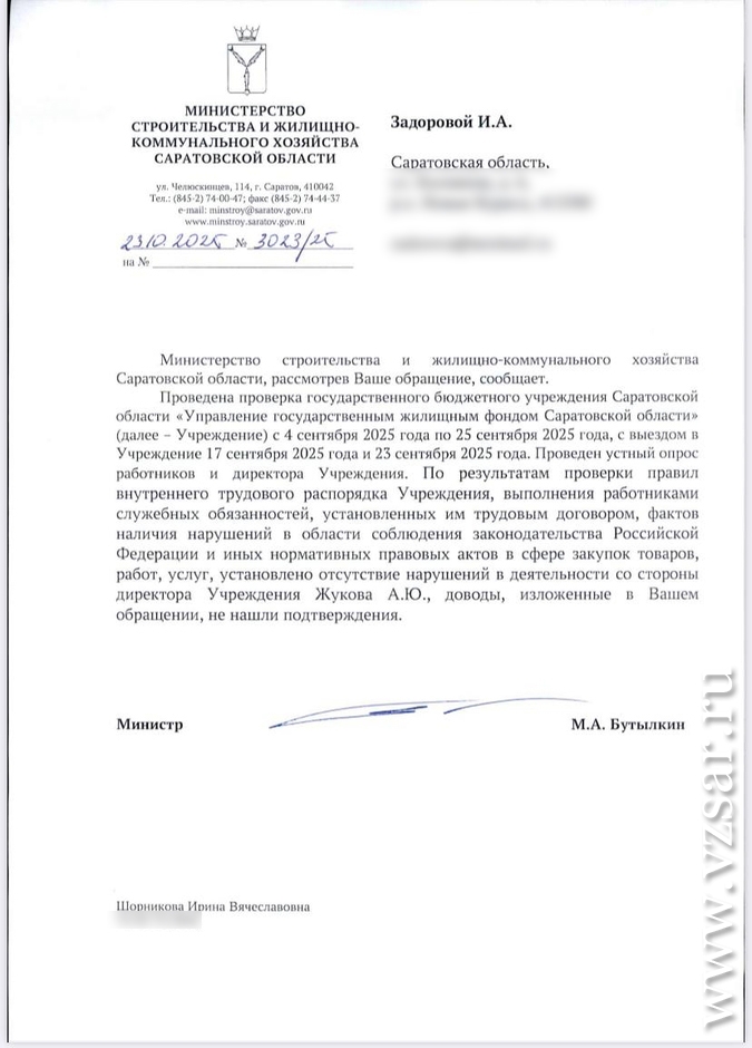 "Я написала жалобу в Минстрой, чтобы к Жукову приняли какие-то меры, однако, несмотря на два вступивших в силу решения суда о незаконном привлечении меня к дисциплинарной ответственности, о невыплате мне заработной платы и о двух незаконных увольнениях, от министра строительства и ЖКХ области Михаила Бутылкина пришла нелепая отписка о том, что "в действиях Жукова не выявлено каких-либо нарушений". – разводит руками Ирина. – Вот и выходит, что справедливости в настоящее время можно добиться только при помощи редакции "Взгляда" и правоохранительных органов и суда, а все остальные бюрократические чиновничьи организации защищают беспредел своих сотрудников. Может они знают, что-то больше о Жукове? Об этом мне остается только догадываться".