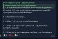 Волонтерский центр города Красноармейск сообщает, что в пятницу, 21 ноября, в селе Гвардейское должны проводить в последний путь Сергея Федорусенко.