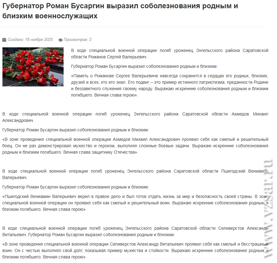Администрация Энгельсского района без подробностей уведомила о гибели Сергея Романова, Михаила Ахмедова, Вениамина Пшигодского и Александра Селиверстова.