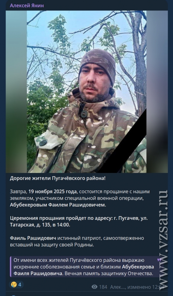 Глава администрации Пугачевского района Алексей Янин рассказал, что завтра в райцентре пройдет прощание с погибшим Фаилем Абубекеровым.