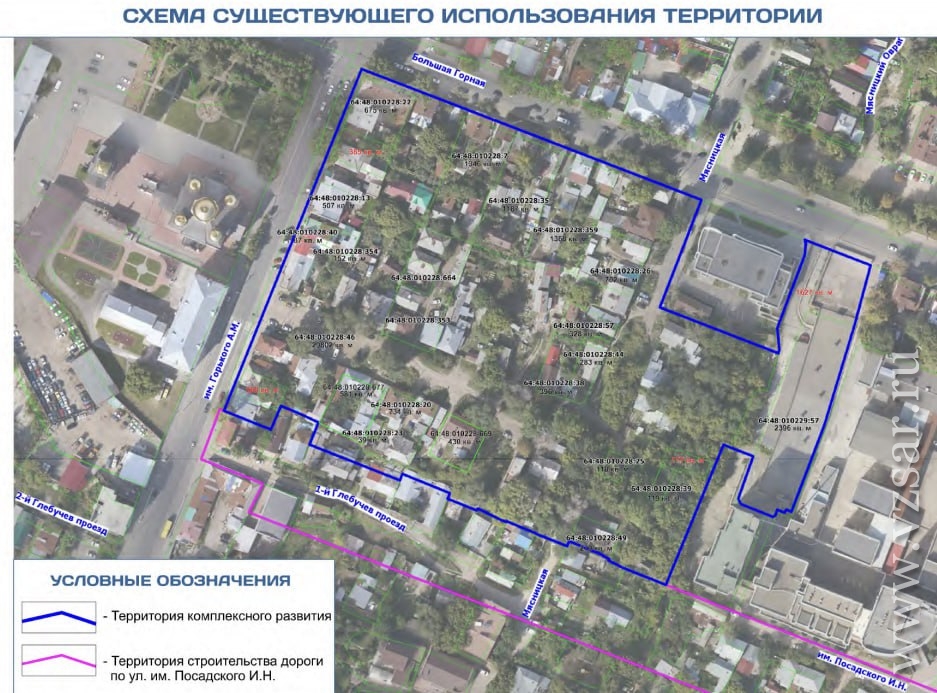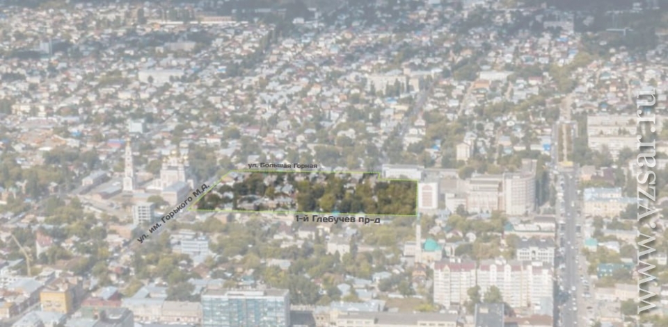 Речь идет о территории, ограниченной улицами Горького, Большая Горная, территорией военного училища (в документе по-прежнему указано ФГБОУ ВО СГТУ им. Гагарина Ю.А) и 1-м Глебучевым проездом.