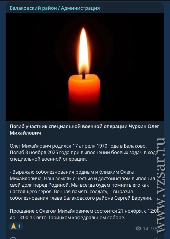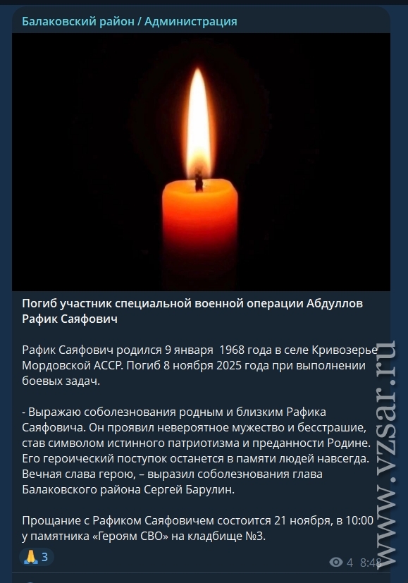 Администрация Балаковского района сообщает о гибели Рафика Абдуллова и Олега Чуркина.