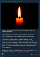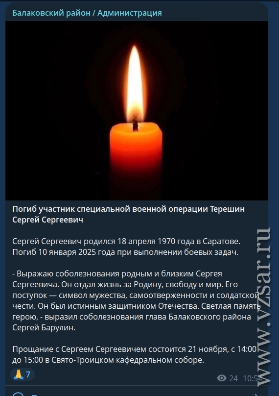 Администрация Балаковского района сообщает о гибели Сергея Терешина.