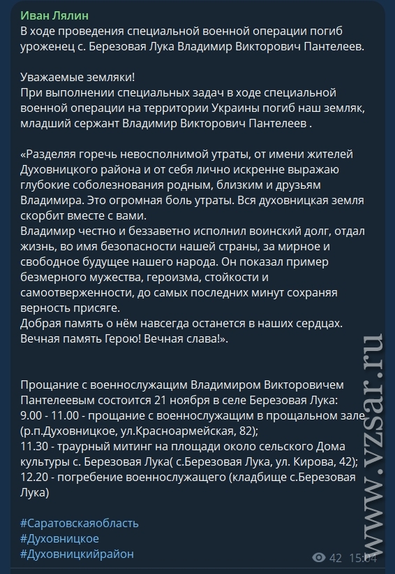 О гибели Александра Волщукова сообщает администрация Советского района, а о погибших Владиславе Мурееве и Сергее Бунине – администрация Энгельсского района.