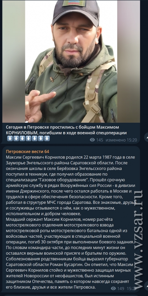 Младший сержант мотострелкового отделения одной из воинских частей Максим Корнилов погиб 30 октября при выполнении боевого задания.