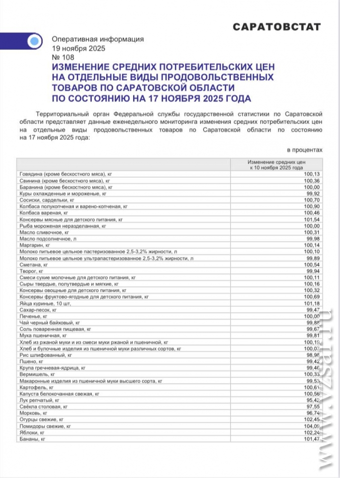 По данным на 17 ноября (по отношению к ценам на 10 ноября), помидоры выросли в цене на 4,09%, огурцы – на 2,45%, яблоки – на 2,24%, консервы мясные для детского питания – на 1,54%, бананы – на 1,47%, яйца куриные – на 1,18%.