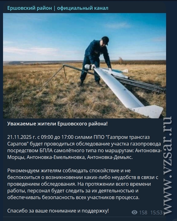 "С 9.00 до 17.00 силами ППО "Газпром трансгаз Саратов" будет проводиться обследование участка газопровода посредством БПЛА самолетного типа по маршрутам: Антоновка-Морцы, Антоновка-Емельяновка, Антоновка-Демьяс.