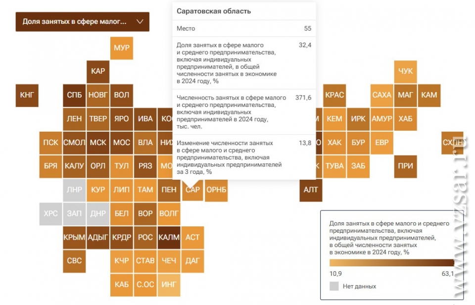 Саратовская область заняла в рейтинге 55-е место с долей занятых в 32,4% (371,6 тыс. человек, а рост за три года - на 13,8%; доля численности работников по стране - 40,0%).