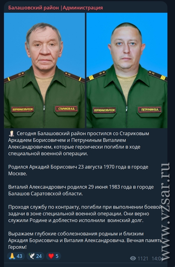 Администрация Балашовского района сообщает о гибели Аркадия Старикова и Виталия Петрунина.