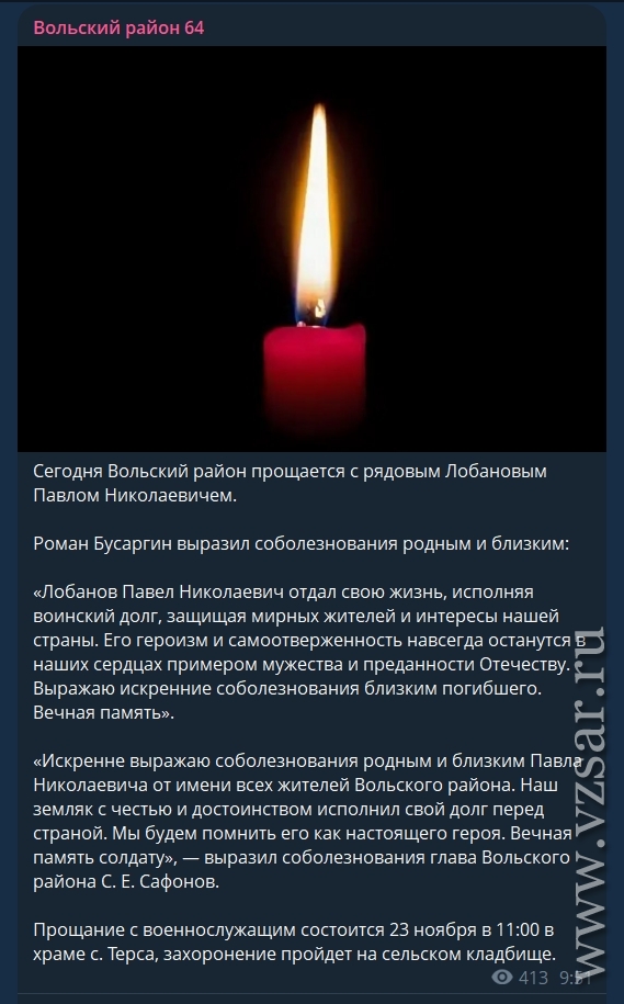 Администрация Вольского района рассказала о погибшем рядовом Павле Лобанове, а администрация Марксовского района – о гибели рядового Михаила Липилина.