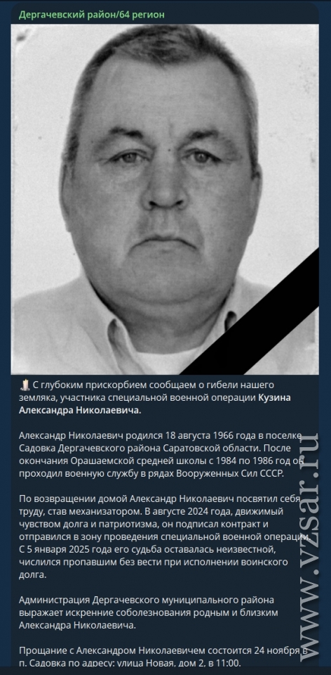 О погибшем Александре Кузине рассказала администрация Дергачевского района.