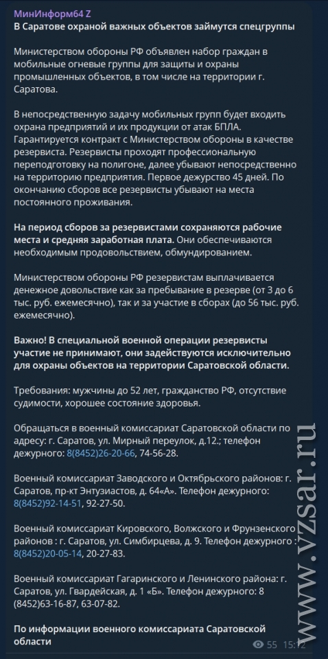 Особо уточняется, что в специальной военной операции резервисты участие не принимают, они задействуются исключительно для охраны объектов на территории Саратовской области.