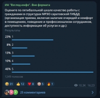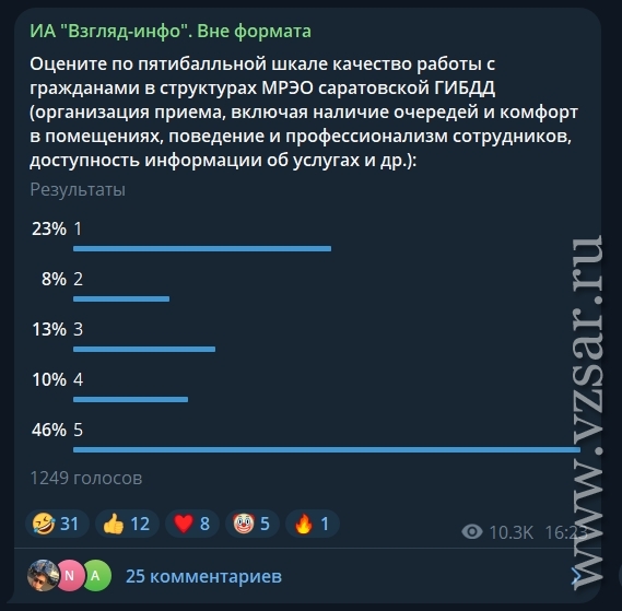 И все же 46% респондентов на "отлично" оценили качество работы с гражданами в структурах МРЭО саратовской ГИБДД. Не исключаем, что среди тех, кто так считает, есть и сами работники этой структуры.