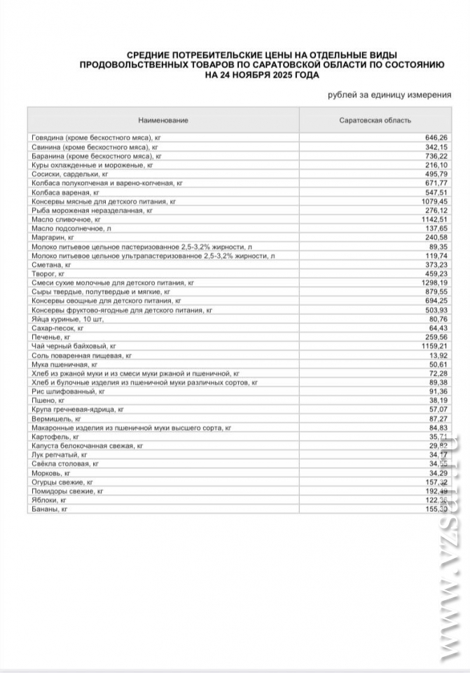 На 24 ноября средняя цена сахара-песка в регионе составляла 64,43 руб./кг, муки – 50,61 руб./кг, десяток яиц – 80,76 руб., масла подсолнечного – 137,65 руб./л, масла сливочного – 1142,51 руб./кг, сметаны – 373,23 руб./кг, кур охлажденных и мороженых – 216,10 руб./кг, капусты – 29,82 руб./кг, свеклы – 34,55 руб./кг, лука – 34,17 руб./кг, картофеля – 35,71 руб./кг, макарон – 84,83 руб./кг, огурцов – 157,32 руб./кг, помидоров – 192,49 руб./кг, бананов – 155,3 руб./кг.