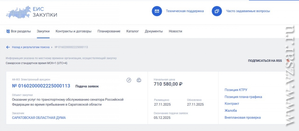 Саратовская облдума объявила аукцион на предоставление услуг по транспортному обслуживанию члена Совета Федерации от региона (от заксобрания в верхнюю палату парламента делегирован экс-губернатор Валерий Радаев). Соответствующее уведомление размещено на сайте "Госзакупки".