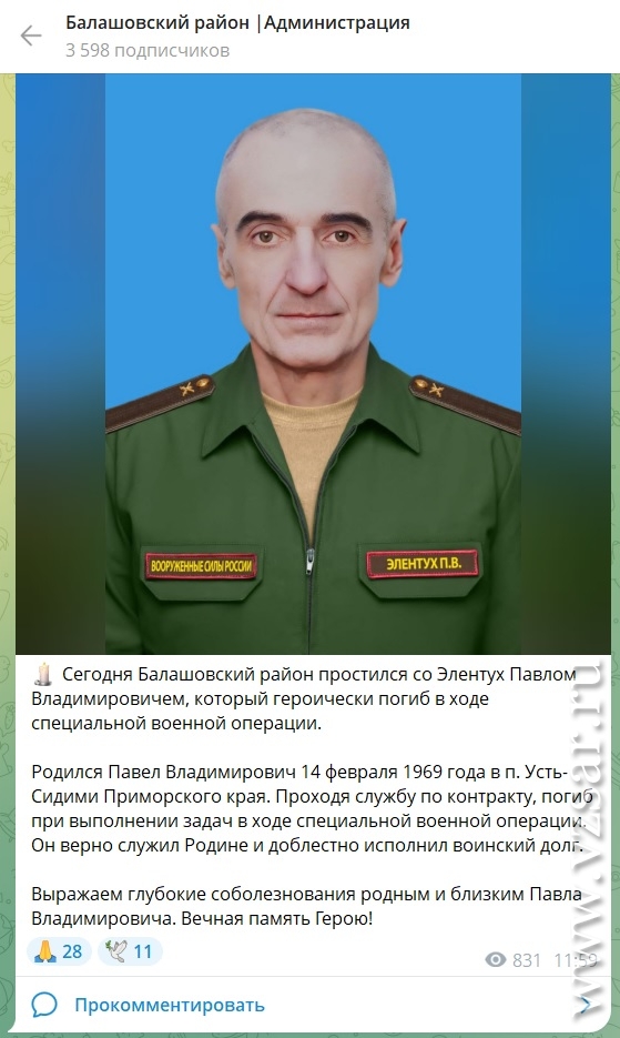 Администрация Балашовского района сообщает о гибели Павла Элентуха, который родился 14 февраля 1969 года в поселке Усть-Сидими Приморского края, а в зоне СВО служил по контракту.