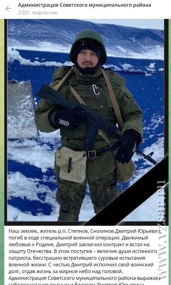 Администрация Советского района сообщает о том, что живым с фронта не вернулся житель поселка Степное, контрактник Дмитрий Снохинов.