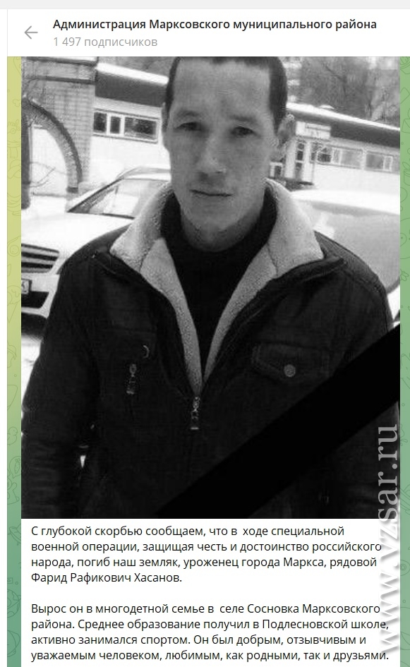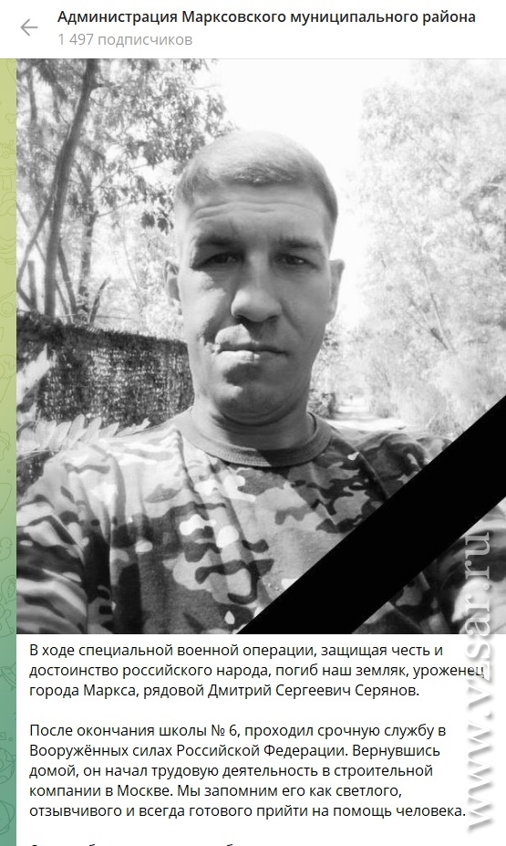 О гибели рядовых Дмитрия Серянова и Фарида Хасанова уведомила администрация Марксовского района.