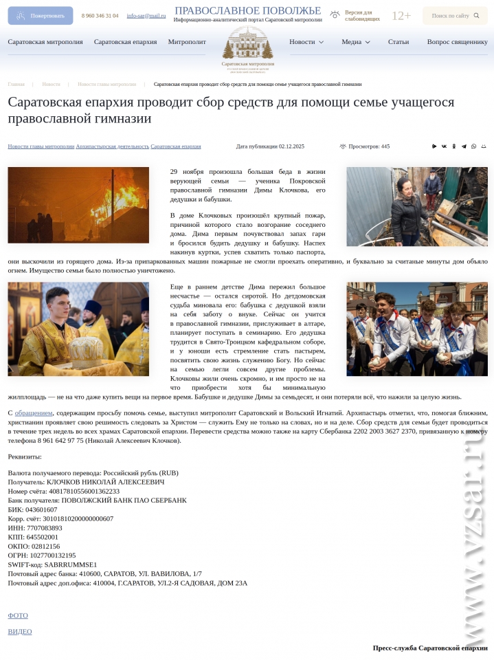 С призывом поддержать семью погорельцев к саратовцам обратился митрополит Саратовский и Вольский Игнатий.