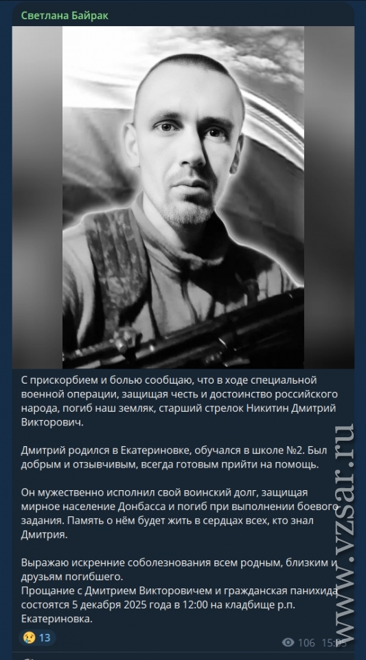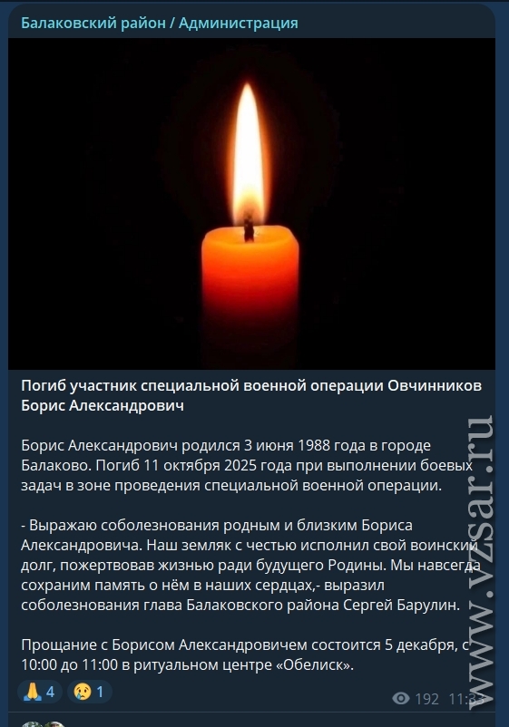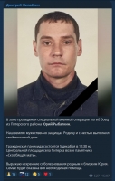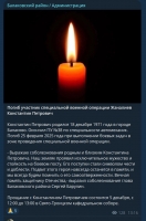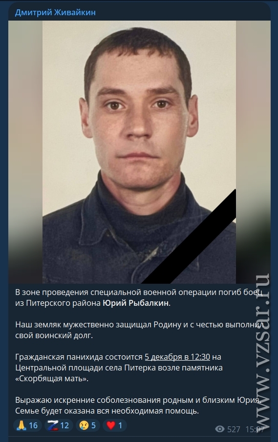 Глава Питерского района Дмитрий Живайкин сообщает, что завтра пройдет прощание с погибшим Юрием Рыбалкиным, а глава Екатериновского района Светлана Байрак приглашает завтра проститься с погибшим Дмитрием Никитиным.