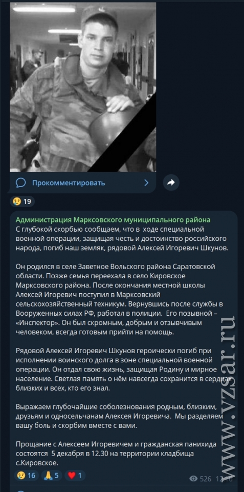 Администрация Марксовского района сообщает, что завтра в селе Кировское простятся с Алексеем Шкуновым.