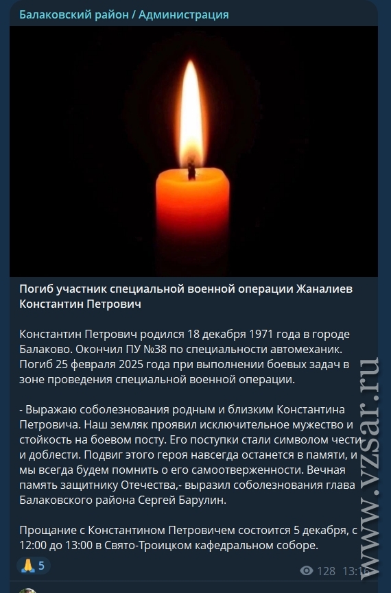 Администрация Балаковского района рассказала, что завтра пройдет прощание с погибшими Константином Жаналиевым и Борисом Овчинниковым.