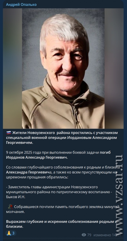 Глава Новоузенского района Андрей Опалько сообщил о прошедшем прощании с Александром Иордановым, который погиб 9 октября.