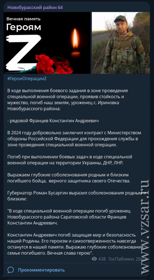 Также администрация Новобурасского района рассказала о гибели Константина Францева.