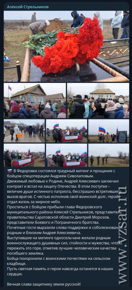 Глава Федоровского района Алексей Стрельников рассказал о прошедшем в Федоровке прощании с погибшим Андреем Сиволаповым.