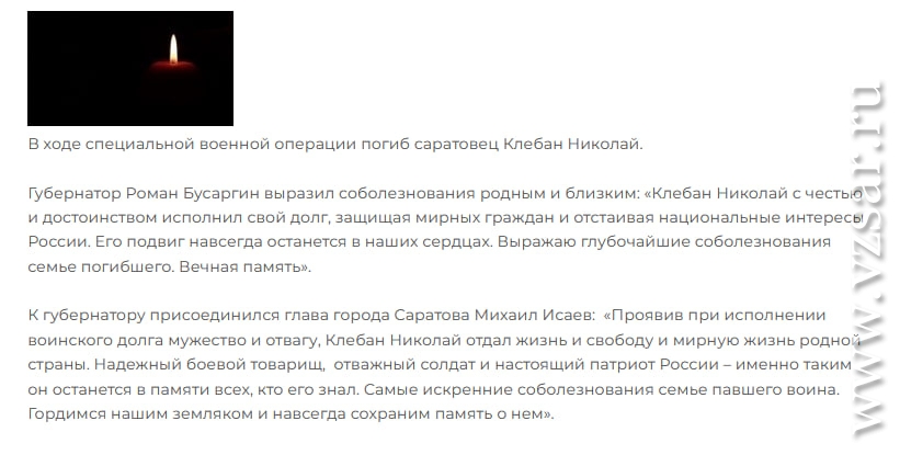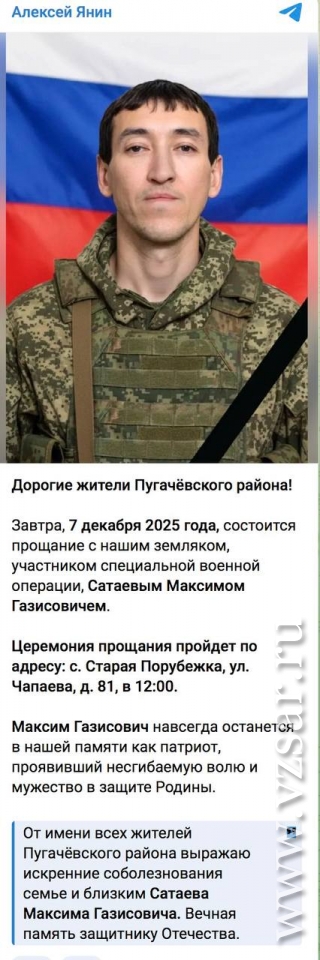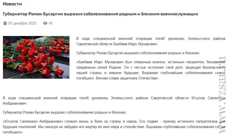 Глава Пугачевского района Алексей Янин рассказал, что сегодня земляки прощаются и Максимом Сатаевым, мэрия Саратова проинформировала о гибели Николая Клебана, а администрация Энгельсского района – о гибели Марса Бикбаева и Салимжона Юсупова.