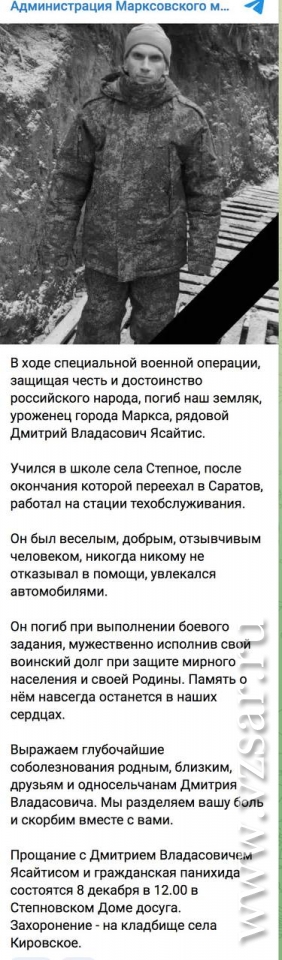 Администрация Марксовского района рассказала о гибели рядового Дмитрия Ясайтиса. Дмитрий Владасович учился в школе села Степное, после окончания которой переехал в Саратов, работал на стации техобслуживания. Погиб при выполнении боевого задания. Прощание с Дмитрием Ясайтисом состоится завтра.