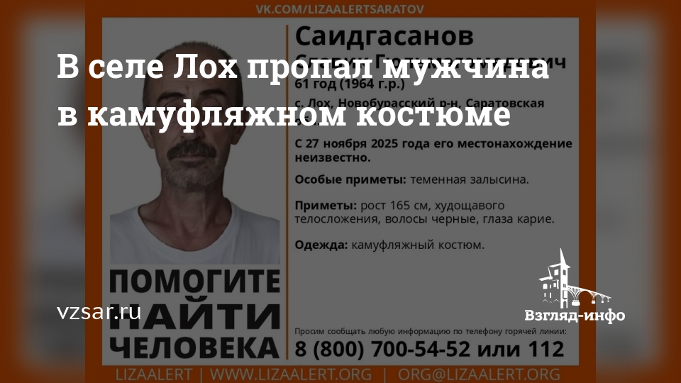 В Новобурасском районе Саратовской области без вести пропал 61-летний Славик Саидгасанов. Об этом сообщает поисковый отряд "Лиза Алерт Саратов".