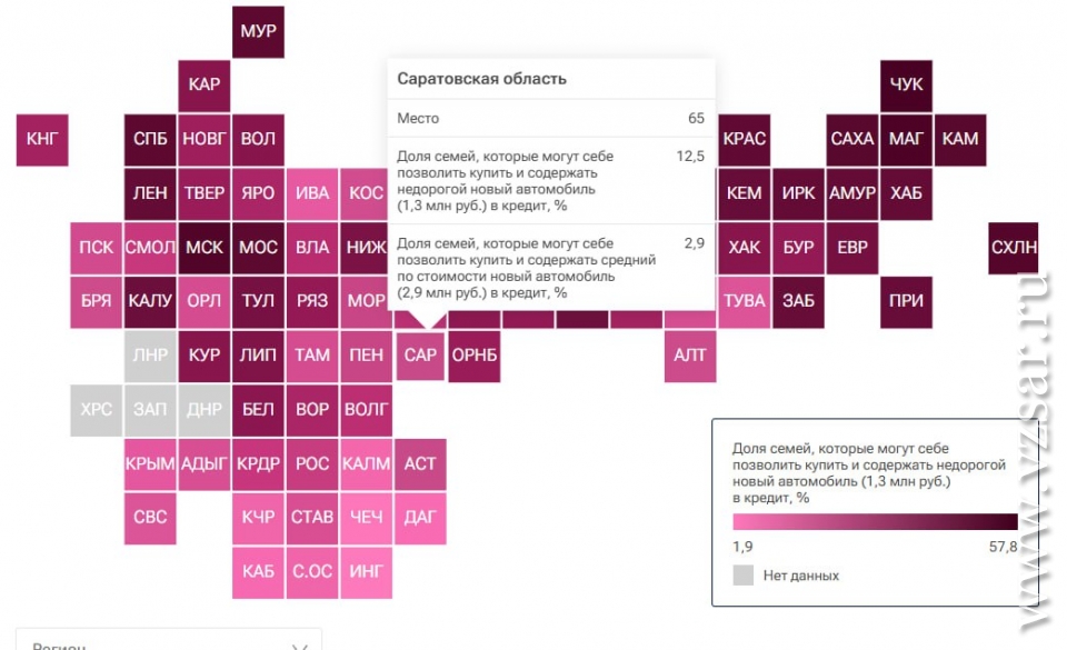 Субъекты РФ ранжировали по доле семей, которые могут позволить себе "ежемесячный платеж при приобретении нового автомобиля (стоимостью 1,3 млн рублей; в прошлом году планка составляла 1,2 млн - прим. ред.) в кредит, тратить деньги на надлежащее полное содержание автомобиля и осуществлять повседневные расходы".
