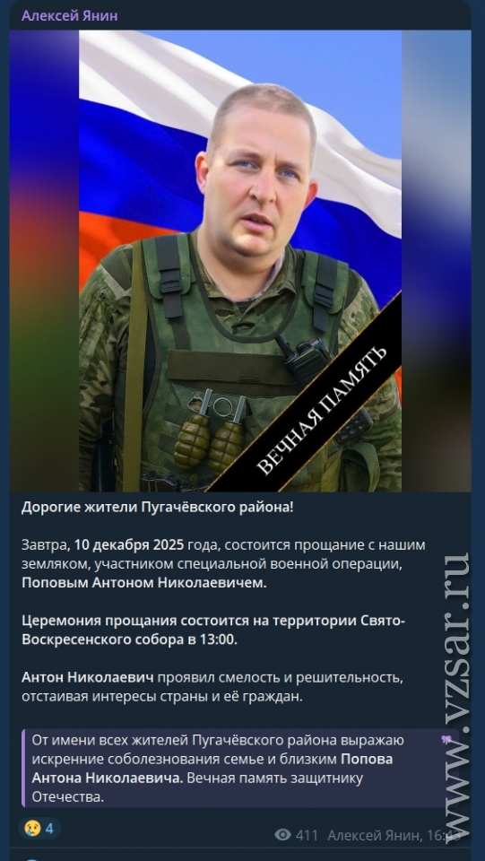 Глава Пугачевского района Алексей Янин рассказал, что сегодня пройдет прощание с погибшим Антоном Поповым.