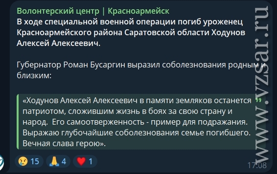 Волонтерский центр города Красноармейск сообщил о гибели Алексея Ходунова.