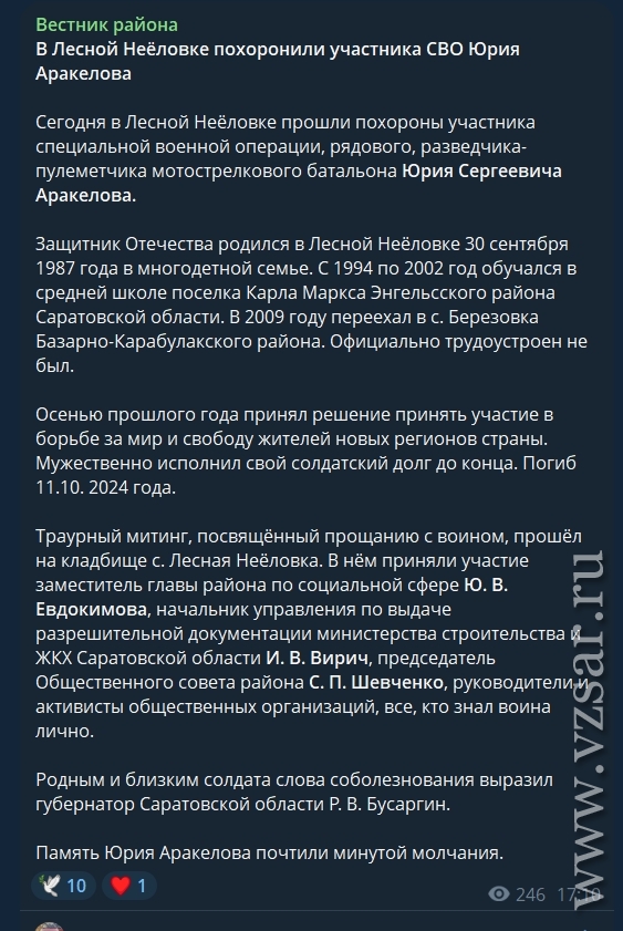 Базарно-Карабулакское издание "Вестник района" рассказало о прошедшем в селе Лесная Нееловка прощании с погибшим разведчиком-пулеметчиком мотострелкового батальона Юрием Аракеловым.