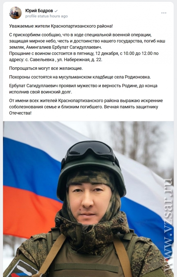 Глава Краснопартизанского района Юрий Бодров рассказал, что в селе Беленка простились с погибшим Русланом Умбеткалиевым, а в селе Савельевка завтра пройдет прощание с Ербулатом Амингалиевым.