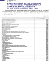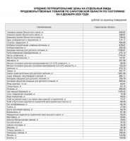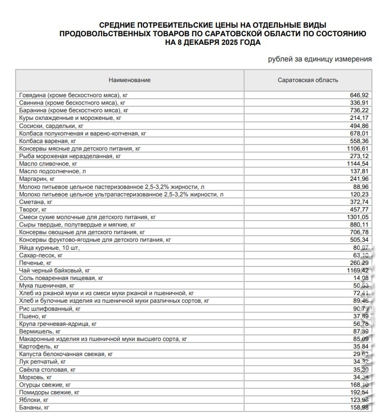 На 8 декабря средняя цена сахара-песка в регионе составляла 63,10 руб./кг, муки – 50,53 руб./кг, десяток яиц – 80,97 руб., масла подсолнечного – 137,81 руб./л, масла сливочного – 1144,54 руб./кг, сметаны – 372,74 руб./кг, кур охлажденных и мороженых – 214,17 руб./кг, капусты – 29,63 руб./кг, свеклы – 35,30 руб./кг, лука – 34,32 руб./кг, картофеля – 35,84 руб./кг, макарон – 85,09 руб./кг, огурцов – 168,10 руб./кг, помидоров – 192,54 руб./кг, бананов – 158,98 руб./кг.