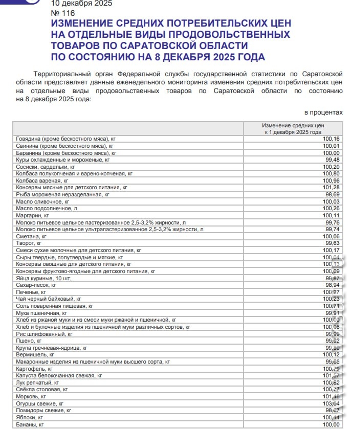 По данным на 8 декабря (по отношению к ценам на 1 декабря), подорожали свежие огурцы на 3,04%, белокочанная капуста – на 1,57%, морковь – на 1,46% и консервы мясные для детского питания – на 1,28%.