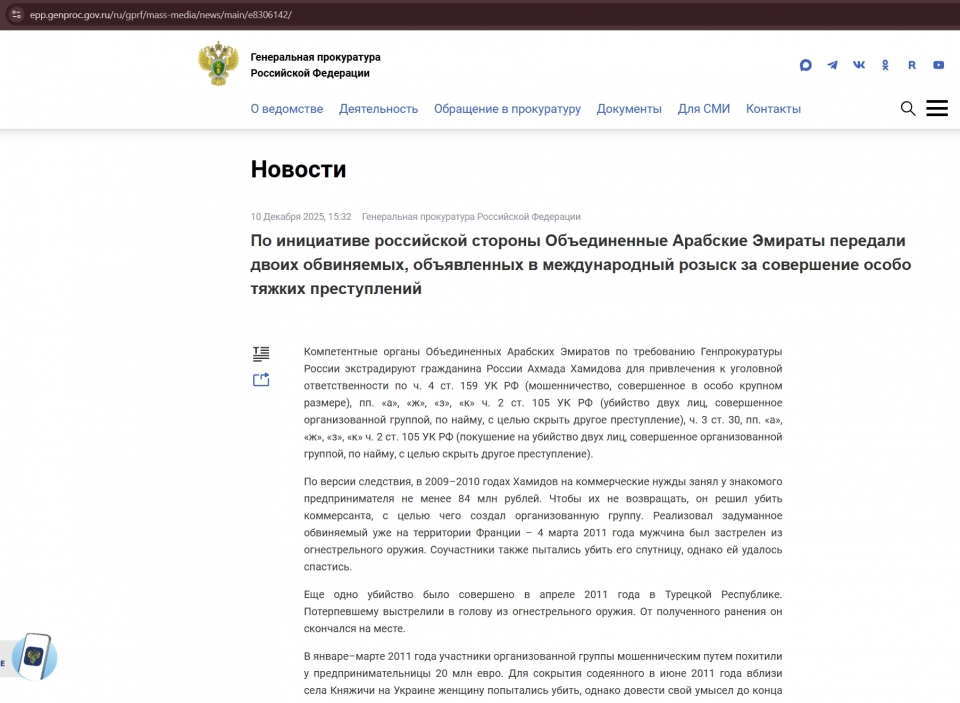 Хамидов находился в международном розыске с мая 2015 года; ему инкриминируется совершение преступлений по ч. 4 ст. 159 УК РФ (мошенничество, совершенное в особо крупном размере), пп. "а", "ж", "з", "к" ч. 2 ст. 105 УК РФ (убийство двух лиц, совершенное организованной группой, по найму, с целью скрыть другое преступление), ч. 3 ст. 30, пп. "а", "ж", "з", "к" ч. 2 ст. 105 УК РФ (покушение на убийство двух лиц, совершенное организованной группой, по найму, с целью скрыть другое преступление).