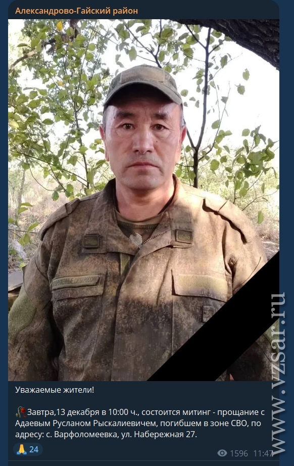Администрация Александрово-Гайского района сообщает, что завтра в селе Варфоломеевка пройдет прощание с погибшим Русланом Адаевым.