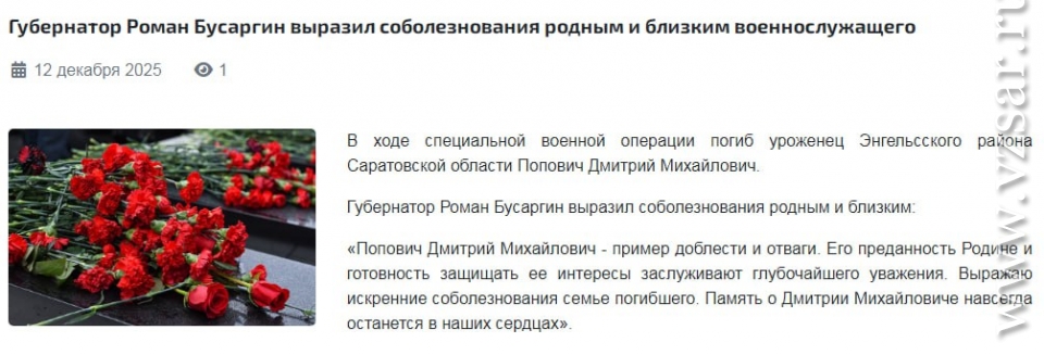 Администрация Энгельсского района без подробностей сообщила о гибели Дмитрия Поповича.