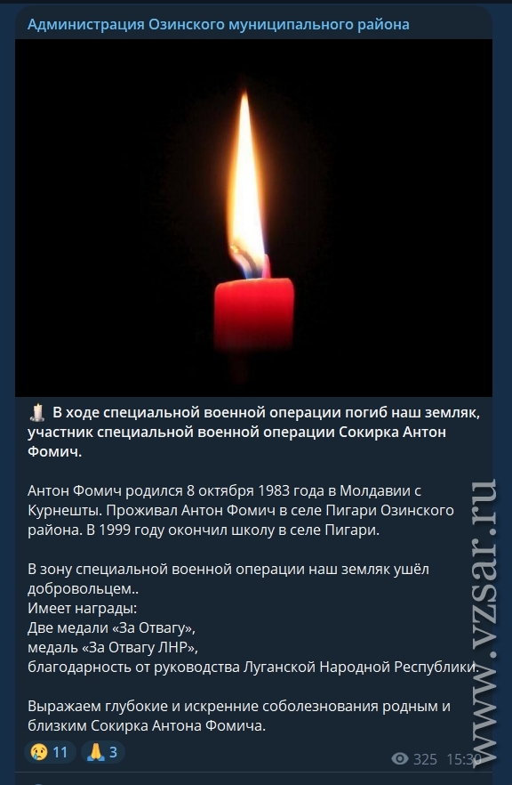Администрация Озинского района рассказала о гибели Антона Сокирки.