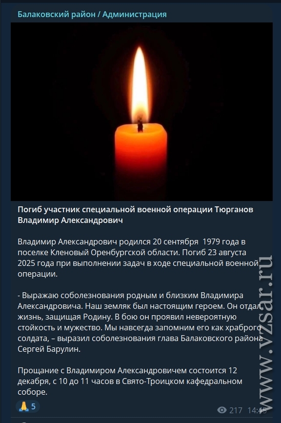 В свою очередь администрация Балаковского района сообщает, что сегодня пройдет прощание с погибшим Владимиром Тюргановым.