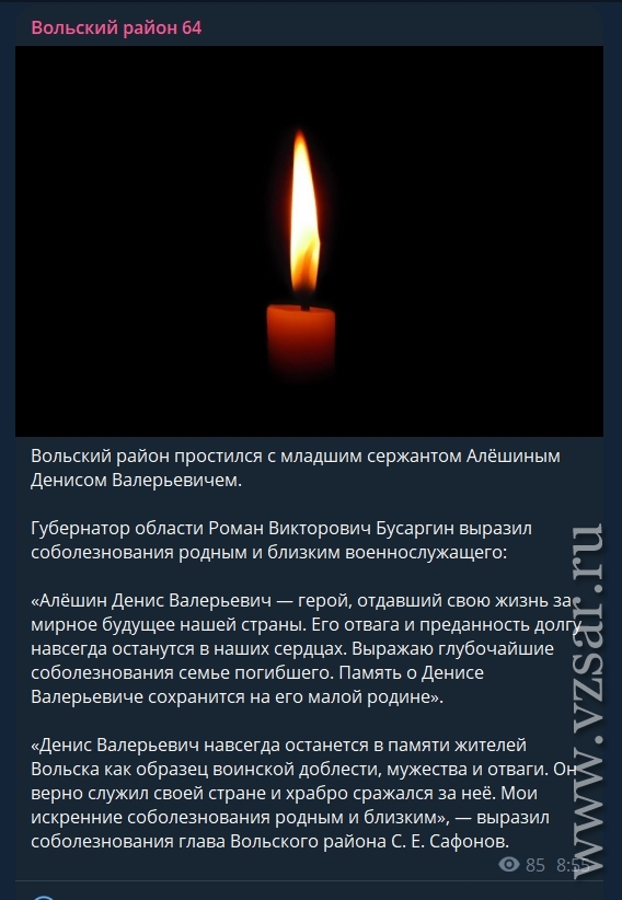 Администрация Вольского района рассказала о прошедшем прощании с младшим сержантом Денисом Алешиным.