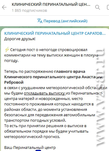 Клинический перинатальный центр Саратовской области ввел новое правило, касающееся выписки матерей с новорожденными. Теперь при ухудшении погодных условий выписка будет переноситься на более безопасное время, сообщают медики в тг-канале учреждения.