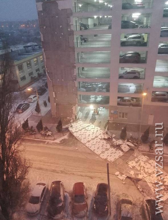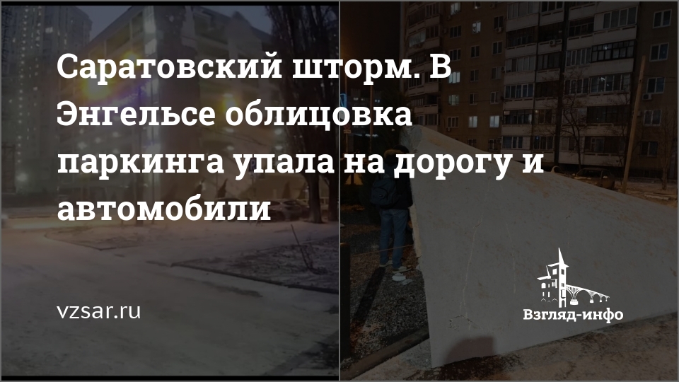Саратовский шторм. В Энгельсе облицовка паркинга упала на дорогу и автомобили