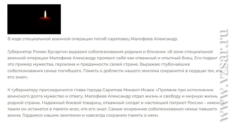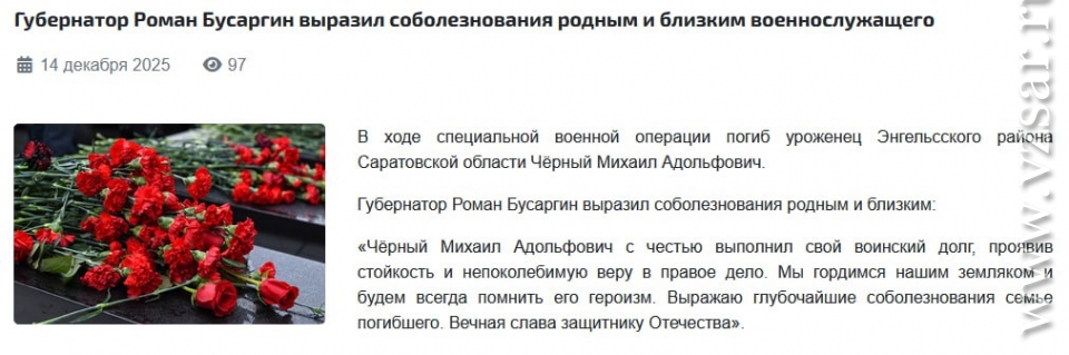 Администрация Энгельсского района сообщает о гибели Михаила Черного, а мэрия Саратова – о погибшем Александре Малофееве.